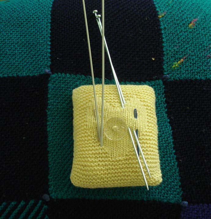 I knitted a heart motif into the centre - but you could knit in anything of course, and I added a large decorative button. (Click on photo to see larger image.)